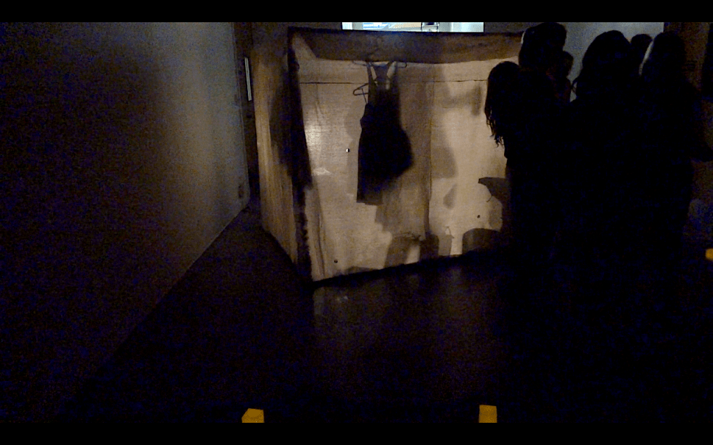 In the dark, a canvas box is discovered, lit from the inside; silhouettes of the body and clothes of a woman appear on the walls. Spectators are encouraged to observe the woman inside the canvas box through small holes cut into the fabric. Parts of her body and activities can be observed but she knows she is being watched. The result is a piece that incites the harmless voyeuristic urge we all have when given the opportunity to spy, and turns it on it’s head when the observer becomes the observed, bringing into question a larger discussion concerning how a woman’s identity develops under the examining eyes of the world.